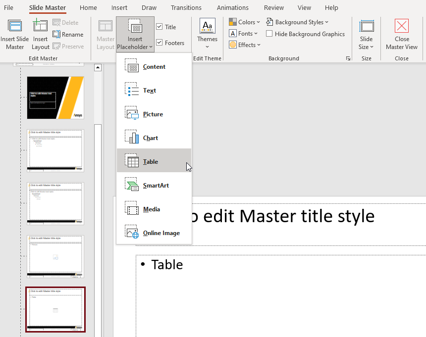 For a table/tree item, Insert Placeholder -> Table.