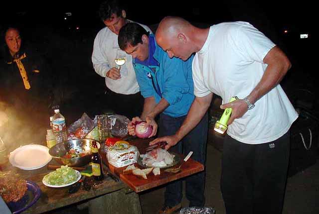 Keeko and Robin supervise while Eric and John make campground haute cuisine.