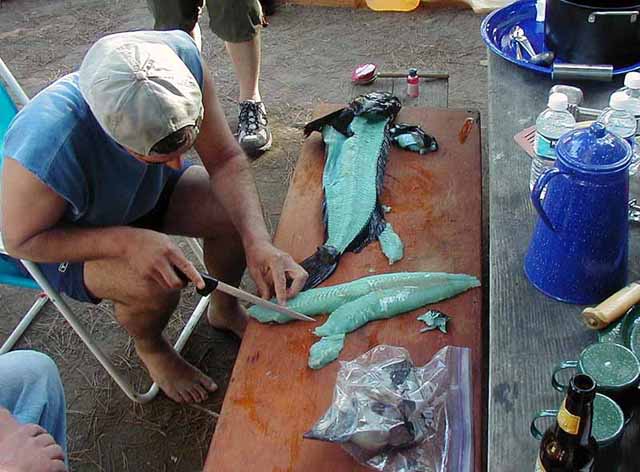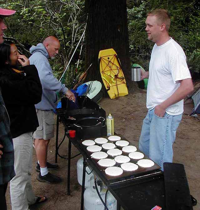 Morning in camp means a good dive breakfast. Eric brings the tools for real camping.