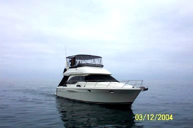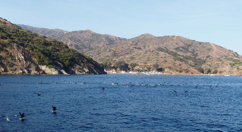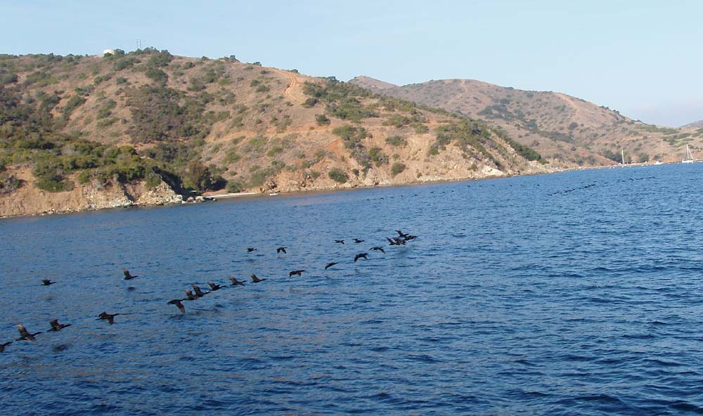 to a nice breeze. Relaxing on the spacious, well padded seating, we had a great view of everything around us. We were commenting on the many wedge formations of some large black seabirds that quickly passed us towards the West, travelling less than two feet over the waves. We passed the dive boat Sand Dollar anchored in a cove while its divers explored a near shore kelp bed.