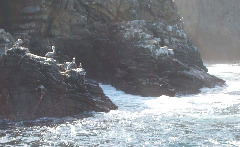 before. The cliffs ended and we came around the wave washed point where pelicans soared on the wind above the cliffs or rested on the mist covered rocks.