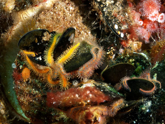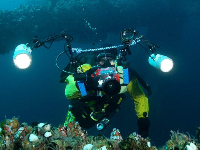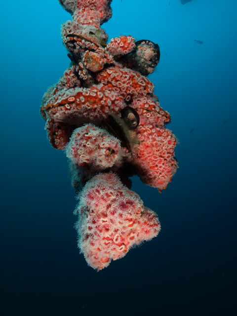 By Jim Lyle Saturday, December 2, we took the six-pack dive boat, the Second Stage, to oil platform Eureka, south of Long Beach. Captain Jeff and his able assistant, Lars, took great care of us. For those who have not been on the Second Stage, she's berthed next door to the Ports o' Call restaurant in San Pedro. The boat is roomy, 43' long, with an air compressor and nitrox fills available. You can bring your own tanks/weights, or use theirs. Lars prepared tasty breakfast omelets before we left the dock, snacks for between dives, and wonderful, do-it-yourself taco fixings for lunch. Why does food taste so good on a dive boat? Scott, Margaret, Todd, Dave, Melissa, and I, all brought our cameras to play with, ranging from venerable Oly 5050s to new digital slrs with all the bells and whistles. Dave finally came over to the dark side, and had his new digital rig out for its maiden dip in saltwater. We couldn't have wished for better weather, Santa Ana winds brought sunny skies and flat seas; water temperature was sixty degrees, with a cold thermocline below ninety feet; and visibility was an honest fifty feet, or more. Great conditions! The trip to the oilrigs only took about 45 minutes. Oil platform Eureka sits in 700 feet of seawater, south of Long Beach. Since 9/11, only commercial boats are allowed to bring divers to the site and no game is to be taken off the rig. As a result, the structure is home to lots of fish and invertebrate life. We did three dives on the rig. The diving was all "live boat," with Captain Jeff carefully dropping us in and picking us up after dives. Cameras were rinsed after each dive by Lars and carefully secured inside the cabin between dives. We finished the last dive of the day in time to see the kick-off of the USC/UCLA football game to the wide screen television! It was a fantastic day, great weather, fantastic conditions, and a wonderful dive crew to take care of us. Below are some pictures from the trip: