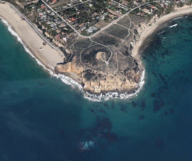 One weekend, my buddy Kevin and I went to Westward Beach (before it had that name) at the south end of Zuma. It's large area by itself, but at the end of the beach is a small area past some rocks known as "Pirates Cove" and was pretty much clothing optional at the time. The cliff there where it starts is probably photographed more than anywhere on the Malibu shore. This is under Point Dume.