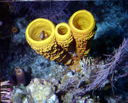 One of the common Carribean species that a diver will notice are the colorful yellow sponges. This one was on the nearshore barrier reef. Peaking out of it, is a buddy of mine.