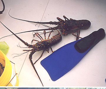 After one dive, some people commented on the lobster they were seeing. Well, the skipper of the boat said 'if everyone wants to, you can take some for dinner'. I guess we really weren't supposed to, but it didn't really seem to bother anyone else... What could I do? Then they gave me a 3 foot stick with a hook on it and said that getting lobsters was really difficult. Huh? I do it by hand most of the time. Well, we went in and I quickly found about a 3 pounder. Carefully slip it between the legs without touching, yank and that's that. There were 6 of us travelling together and you immediatly see the change. Everyone is moving in hunting mode. We evenly spaced at about 50 feet and with no pre-planning, moved across the reef in formation. I found one more keeper as did Karen. I took them with the hook, though I have to say that reduces the sport of it some, but does protect the reef. They are even more spiney than California bugs. Good dinner.