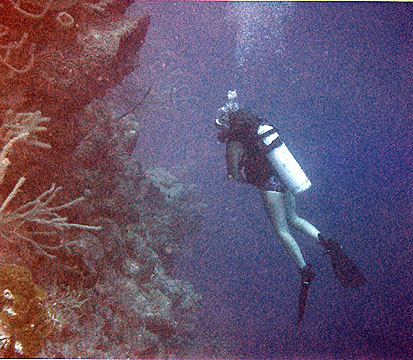 What! You want us to do what! Buddy dive!!! That's about the most dangerous piece of equipment you can bring down there. A what! You want me to dive with a fem! Come on! Well, I'm really not supposed to kill anything anyway. What the heck. Well, it turned out that Karen was a great diver and took me a place or two that I might not have gone on my own. As I have found when travelling, while there are some newbies, there are many amazingly experienced divers as well. She was one of them. She was a native Carribean diver and swam like one, with her arms held in front of her to make sure that none of her hoses or gauges touched the reef. She was nice enough and decided that that I was probably OK, when she found that I wouldn't touch anything. Warm water diving is so different from cold water, in that respect.