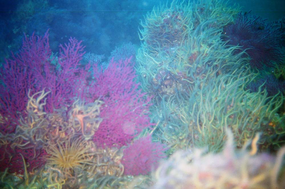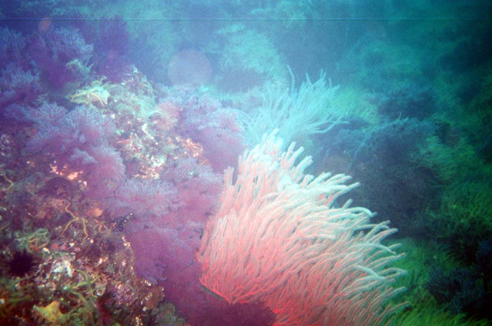 I did a tiny stride entry and immediately saw the rocky reef below me at about 35 feet. Vis was great, perhaps 50 feet. There were a lot of urchins on the open parts of the rocks, mostly purple urchins, but a number of big red ones too. Much of the area also had a thick cover of brittle stars, but they were relaxing, waiting for the current. I was taking pictures of them and then some delicate tube anemones as well. Best of all though were numerous small, vividly lavender sea fans. I don't remember seeing such pretty colored fans before. There were also some of the more common large gold sea fans. It was beautiful there, but I wanted to move on to the thick, lush reef growth I could see on the larger rocks. There the life was thick and diverse. Sea Cucumbers in the rocks had their feeding fingers out everywhere. There were some good corynactus displays, even some entire rock faces covered with them. I was seeing cowerys, small turban snails, all kinds of sponges including vivid yellow sulfur sponges. There was even a little hand sized patch of cup corals. In places like this, every inch is covered with various invertebrate life. It is colorful, beautiful and fascinating. The water was about 64 degrees and felt warm enough to dive in all day without noticing any chill. |