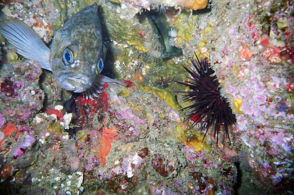 I made it down into a small calm area and started breaking purple urchins. The good part is that the iron would clip them in half with one easy hit and the fish were really enjoying it. There were about 15 garibaldis and innumerable other little finned denizens. The bad part is that my experience has shown that if you break urchins like that, you are going to get spined some. Annoying. Then this nice sized, colorful cabazon appeared. He didn't seem to want urchins, but he just kept swimming around in the small area I was in. I was taking pictures and he would move around, but he never went far. I could get as close as I wanted and he just hung out. |