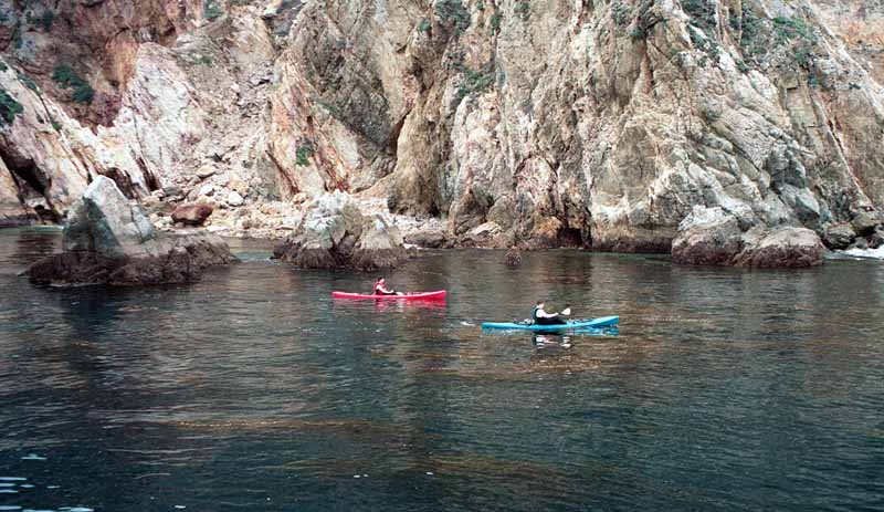 As we came around one rocky point there were a couple of boats anchored. One looked like it would be good for diving. As we came closer to it, we saw a friend. Naoki was getting arranged on the back of the boat with a bag of bugs in hand. He said that Tom was still in the water. How very cool. We stopped for a while to say hello. It is a somewhat small community of divers that regularly visit Catalina in their own boats to dive for lobster and white seabass. The other smaller boat was another friend as well. He was line fishing just now, but he would be diving for white sea bass on his next trip. You couldn't ask for a more peaceful morning for boating and diving. Some kayakers apparently agreed as they headed up the coast along the shore.