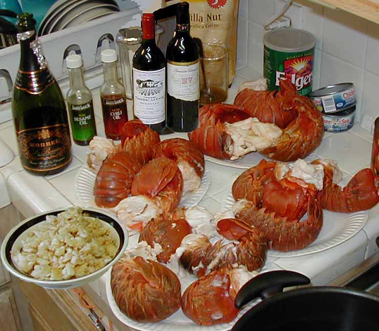I looked in and the girls were awake, but dosing, waiting for us. I said 'hi' and went out to get gear off. They went to bed. Ah, there is nothing like a hot shower at a time like that. After changing into my clothes I went onto the swim step to look for Mel and enjoy the night. It was smoothly calm and every so often a boat would pass by. Occasional sea gulls, flying by invisible in the night mist, would call rauchously, 'mine', as they flew by. The night was beautiful and peaceful. After about a half an hour drifting in the sea dreams I saw the glow of Mel's light near the point. He had made a real good dive and filled his limit.
