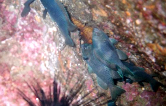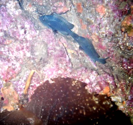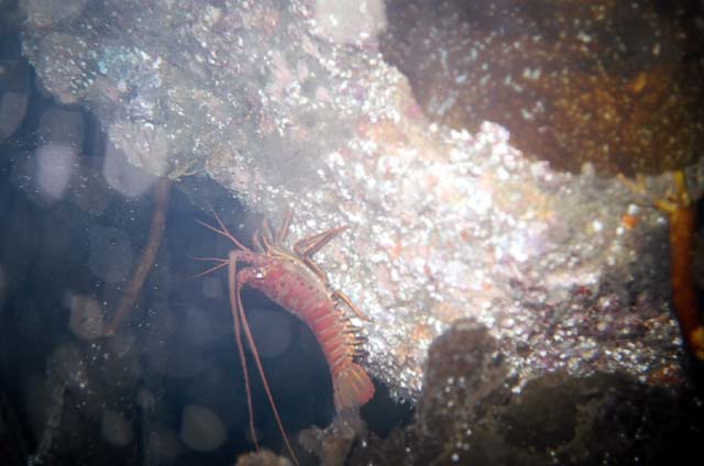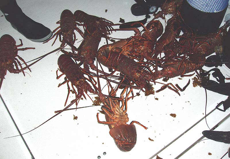 I use a compass a lot to judge where I am. On this dive and the last, I definitely missed having it. It was very hard to judge where I was. ![]() OOPS. They spilled. The third dive was a problem. The bugs were generally deep and we were mostly out of bottom time. There are a lot of shallow spots, but they are not going to be productive. Mel planned to sit it out and hit a deep reef in the morning. Dell and I wanted to try another night dive. My third tank was a bit small for any kind of deep dive anyway. There was a place I knew of that I had done well last year, so I mentioned it and Mel took us near it. With the lights off, baitfish congregated behind the boat. ![]() Have some colorful anchovies." Now I've said that if you don't dive enough, things tend to go wrong when you do. I had already had the problem with the compass and there had been other minor annoyances. I was aware that there was the problem of ongoing issues arising. Deal with them. Your judgment has to be not only good though, it has to be correct. The next dive showed a lot of 'I would have done things differently if I had known'. I put my regulator on my AL 80 that is my third tank and it had been filled with NITROX more than a year ago. It was down to 700 pounds. Note to self... double check that... So I decided I would go near to shore and free dive, using my tank when I wanted to check something out. Dell and I headed in. I went for a long swim to shore to a point in front of the boat. Well, when I got there, I headed all the way in, planning to work my way out, but there were bugs in very shallow. Many bugs, little bugs, littler bugs, little bugs with very big antennas. I figured there had to be some legals, so I was trying to free dive with a tank in 1 or 2 feet of water. Ah, judgment... I should have done a quick dive under the boat to check if they were in the sand and then come in here with no tank. I spooked up some big rock fish that was gone before I could see it. I saw some bugs that were almost worth grabbing. I rode the little waves in an out and bounced over the rocks. Sometimes small bugs spooked up and ran into my sides and legs. Surprisingly, the baitfish kept bumping into me. It was too overcast to watch the stars so I never did my usual haulout. I worked in as shallow as I could go and figured I would go a bit deeper on another pass. I reached the end of the shallows at a small point and turned out to go deeper. There were bigger rocks and lots of eel grass, but it only a few small bugs. Then I felt my weight belt slip. It had gotten unclipped while I was bouncing on the rocks. That is a minor issue except that I was pretty sure that my new belt clip I had picked earlier had probably slipped off with my goody bag. Yep, it did. I backtracked as best I could, but never found it in the eel grass or the rocks. It was pretty thick there. This all seemed to sort of suck so I figured it was time to head back. I went down and headed out over the sand planning to use what little air I had to look around and come up somewhere near the boat. Well, there was nothing to see and the boat turned out to be farther away than I expected. It gets difficult to orient at night. I needed to go about 100 yards to the boat. Bad luck. There was a current and I'm not in great shape for that kind of swimming. I swam a bit further and knew that I was going to have to do something different if I wanted to make it to the boat. That judgment thing again. I could drop the weights out of my belt pockets to make swimming easier. It's too nice a belt to drop except in an immediate emergency. I could swim to shore and work my way up along it against the direction of the current, then swim back out to the boat. That would be a long haul for the last dive. I decided to try something different. I loosened the belt on my back plate and swam on my back. I generally never do that, but it worked pretty well and I really chugged along, though I moved towards the boat very slowly. I was afraid my knee wouldn't take it, but it didn't seem to mind. The problem was navigating since there were no stars to see, but if I kept the island in the corner of my vision, I was aimed correctly. I made it, but it was a hassle. I used to not mind long swims, but these days I am careful to never get down current. All in all, a lot of things were done on this dive that I would not have done in hindsight. Well, a nice warm shower and some dry clothes will make you feel fine. I saw Dell's light way down current along the shore, but he moved up again before swimming out to the boat and had little trouble. He had seen the same thing as me. A whole lot of short lobsters. The next morning dawned beautiful with a low fog hugging the island. The ocean was lake like. It's very quiet then. Mel wanted to do a deep dive on a small obscure isolated reef that he has been trying to explore for years. It probably gets visited less than 5 times a year if that much. On NITROX with good conditions he got a better look at it than ever and found out it was far more extensive than he thought. |