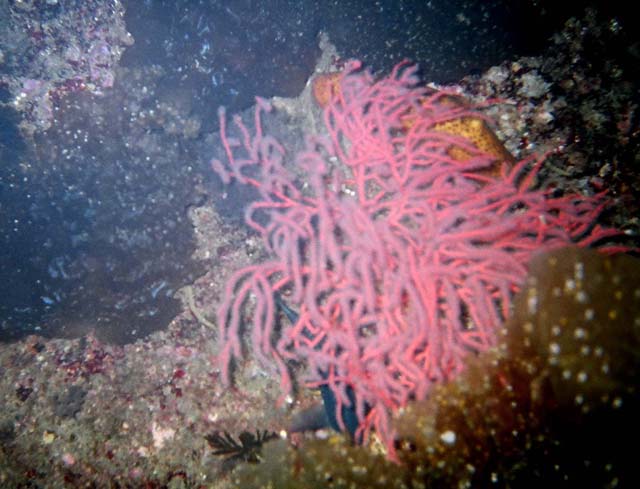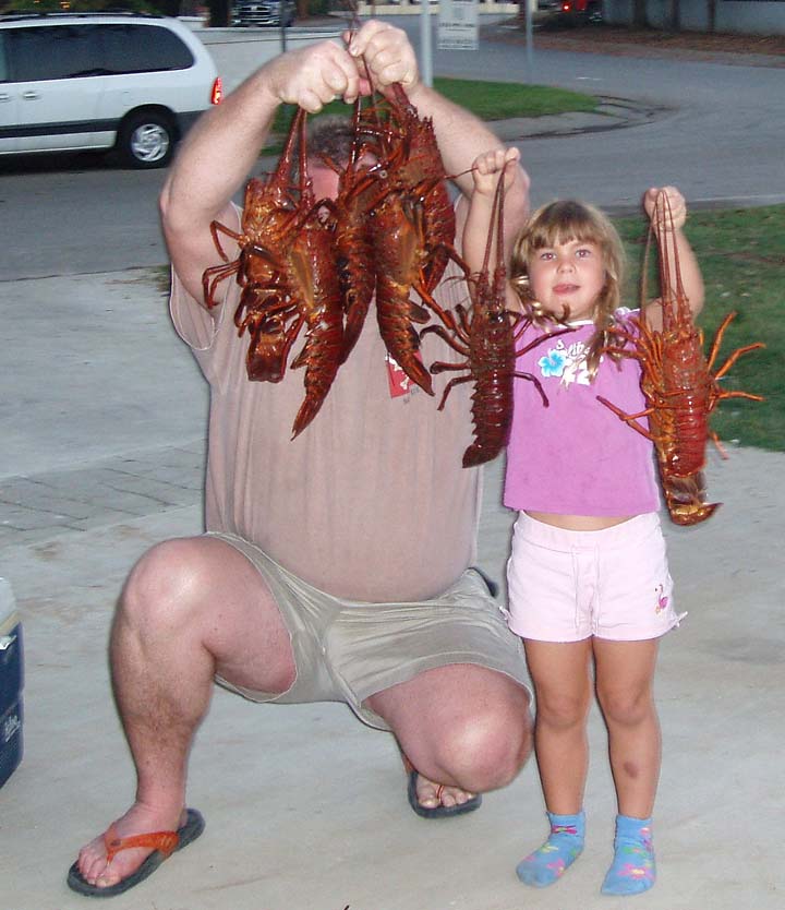 ![]() There is lots of life to be seen under the kelp. I came to a nice crack going in about 10 feet between the rocks and thought there has to be a bug in there. I backed off a bit, then carefully went to the lowest point of the crack and worked under the kelp. Nothing. As I came out the other side, way down through a bunch of kelp, I could see a short lobster. I decided to take a picture. ![]() Way down there. There were a few more bugs to be seen, but they all looked short so I decided to work on photography. I do believe in task loading for my diving. There were more gorgonians, but none of the zoanthids I had seen last time I was here. There were various fish snoozing and a lot of very active blacksmiths. I saw a couple nice sized scallops. I ran into Dell a couple of times. It was an absolutely beautiful dive in the thick kelp. ![]() There were nice gorgonians all over. Finally I was low on air so I went to the top of the pinnacle and made my ascent. Great dive but few bugs. Mel and Dell did get some, but I never saw anything legal sized and the hunting in kelp that thick is tough. ![]() Mostly what I was seeing there. Glimpses of obviously short bugs way under the kelp We traveled a short while to another area that Mel said was promising. A little warm water from the shower into the suit and we hit it again. Dell and I went down in the same place. The reef started at 80 feet and there were bugs everywhere. Little bugs, big bugs and bugs sitting on the kelp. I was grabbing and stuffing and I could see that Dell had hit it too. A couple times I saw two together, a small and a legal. It seemed the short was always in between me and the larger one. I sort of drifted a bit past 90 feet and didn't see any more so I headed back up to 80 feet, but I definitely seemed out of all the bugs I had seen at first. I kept looking around and did see a few shorts, but it was nothing like the first few intense minutes when I went down. That location was sure some good advice from Mel. ![]() Mel got a couple of real nice ones.