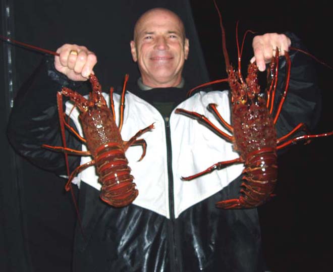 A gorgeous evening. That's a good way to start. I had taken off early to get through the LA traffic to the landing. I was early enough to stop at Pacific Wilderness to check out what new dive gear was in and pick up a few things like a new clip for my goody bag. That is a great dive shop. It was cool and quiet at the docks when I walked down to the boat. While arranging my gear, Dell showed up. I hadn't met him before, but Mel had told me that he was an avid free diver spear fisherman. He seemed like a real nice guy and we talked as he arranged his gear aboard. He had been diving since he was a young teenager. Soon Mel showed up and after a bit of boat prep we were ready to go. Leaving the harbor, we encountered only minor chop. That was a good start. It seemed like a soft warm night.Mel had said that we were going to go to a small isolated pinnacle that was very productive at the beginning of the season. I had been there once before with him and it is a beautiful dive spot that is rarely visited because of its depth and isolation from reefs around it. It is only about the size of a large house starting at 108 feet and rising to the top at 55 feet. You tend to spiral around it from top to bottom. If there is a current, the lobster may congregate on the rock face where the current hits. Mel gave Dell the signal and he dropped the anchor so that it should go right over the pinnacle. As I geared up, I found out that my compass that had been showing signs of magnetic weakness before, now had a bubble in it. It was basically useless. We got organized and went on down the anchor line at the same time. The water felt warm, but there was little bioluminescence.