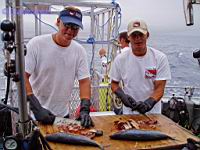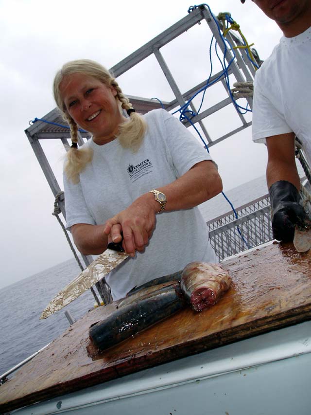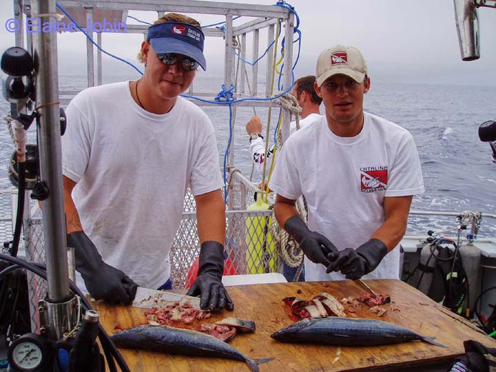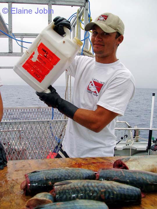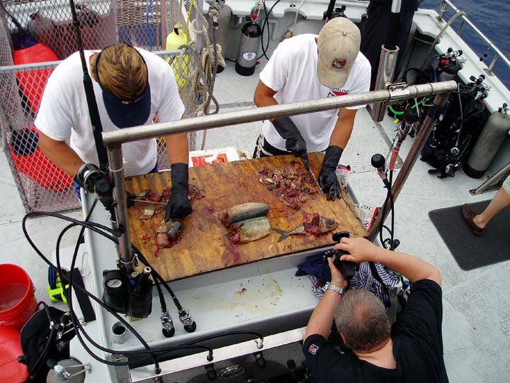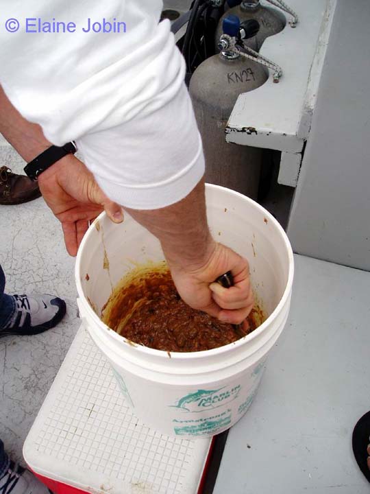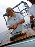 Once underway, the crew set about making the chum. Chopping up something that would be appealing to any passing sharks was a major production that took several hours. Passengers were invited to assist in the process if they so desired. I’m in the photos below helping to dice tasty fish chunks. I hoped that the spice of my "elbow grease" would add that "special something" to the chum.