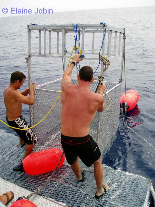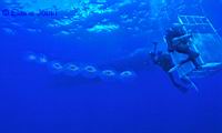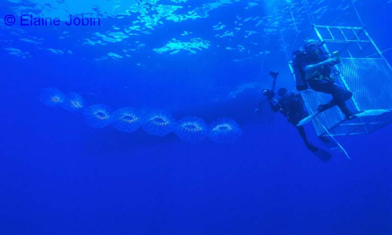 Any divers who wished to sit in the cage and wait for the sharks were welcomed to do so. I was off the boat and into the cage without hesitation. I hoped that if the sharks could actually see something in the deli section, maybe they would come. I sat in the cage, at about 10 feet, for an hour. There wasn’t much to do but watch the chum go by. As I waited, I day dreamed of a visit from a great white. I planned the photos that I would take and wondered exactly how I would handle such a visit. Eventually, I did get some visitors, but, it was just two of the Brits who got tired of waiting on the boat. I spent another half hour taking some photos and swimming around with the divers. Finally, after an hour and a half, I decided to climb out of the water and see if it was lunch yet.