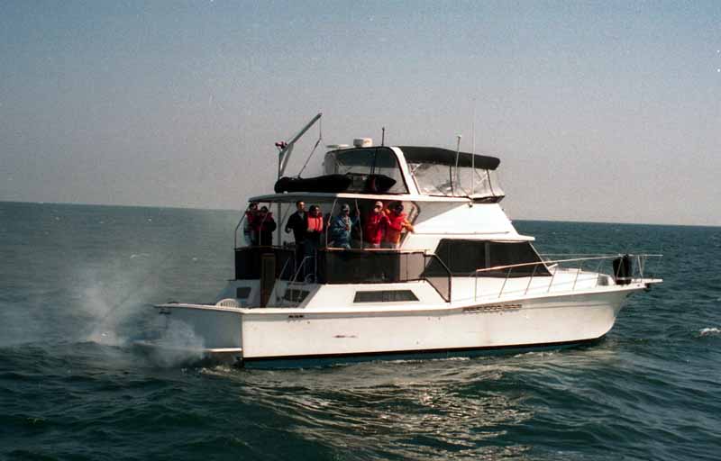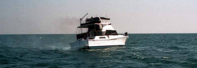 would've had a bit of trouble getting people aboard let alone stopping. As we got close to the up wind starboard stern of the cabin cruiser, they passed by on the port side from the bow. Mel pulled us close alongside, stern next to stern, starboard to starboard. I yelled at them to throw me a rope and one person jumped down to the rear deck and threw me a line. Stacey was at the stern and asked if they had called the Coast Guard. The reply was a frantic "help, we need help ".