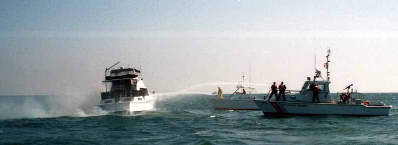 On the Rapture, the Coast Guard had gotten the immediate information of who was who and what had happened so far as it was known. They called Baywatch to see if they could take the people to shore. Offloading them was exciting and the boats bumped a bit. The coast Guard thanked us for our assist, but he wouldn't let me try their .60. I said I just wanted to put the cabin cruiser out of its misery. He said the firemen wouldn't like that, but it would have been an oily wreck anyway. They boarded their boat again. Good boat handling meant that they never touched the Rapture either time they came along side.