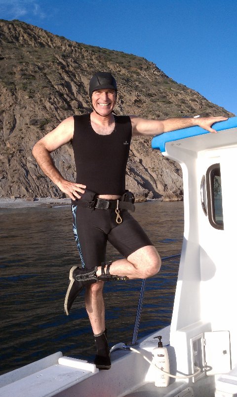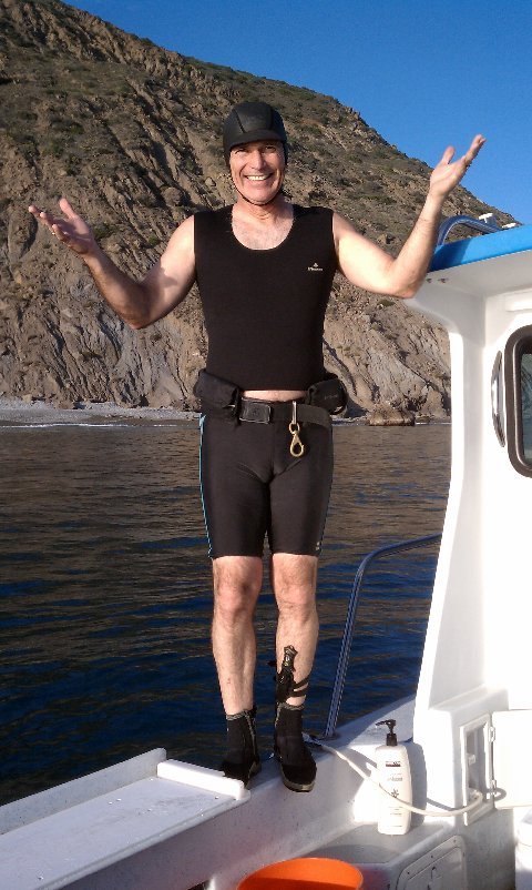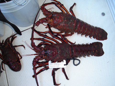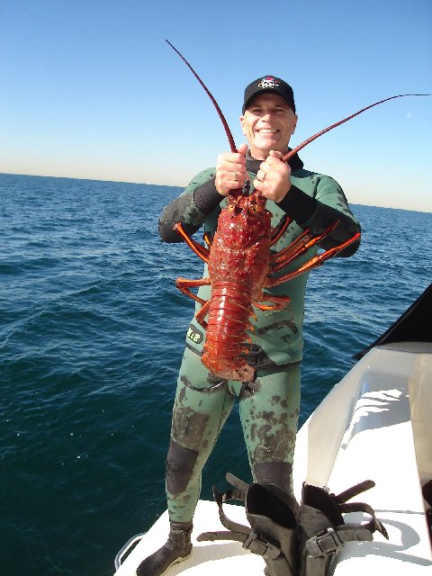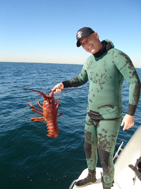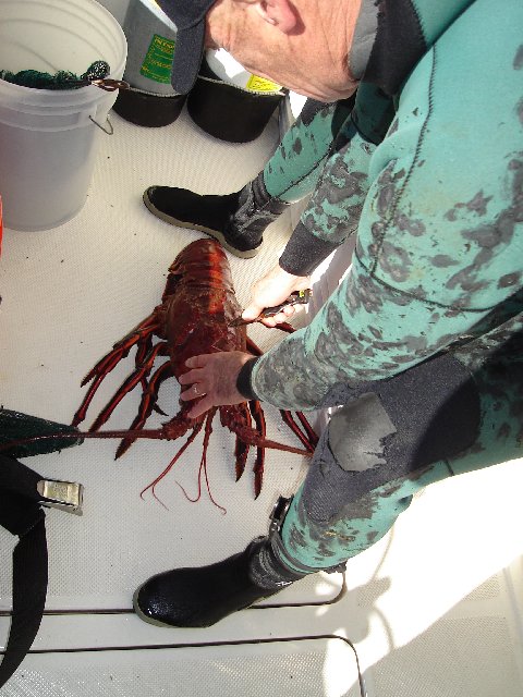Mikey....I had an unusual dive Friday. Tom and I went out for some lobster diving. The plan was to go for some freediving on Saturday so I brought gear for both. Because it wouldn't all fit in my bag I kept my wetsuit separate and put it on the back seat of my car. When we got to the dive site and I started to suit up I realized that I had left it in the car. For a second I thought my dive trip was over but then my addiction kicked in and I figured I could tough it out without a wetsuit for at least one dive if I had to.Tom had no spare wetsuit but he did have a small vest and a neoprene swimming cap. Neither really fit me well but they did stretch on. I had my own booties and gloves so into the water I went looking like a tropical diver.