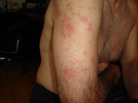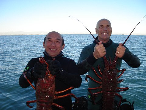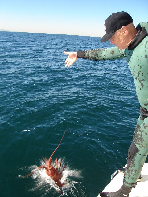 When I first hit the water I completely lost my breath for a couple of minutes but then I settled down and off to bug diving I went. Soon I grabbed a nice one and missed several others. I felt fine and began to wonder why we go through all the trouble to dawn the cumbersome wetsuits anyway. I was thinking of doing at least a couple of dives. I grabbed a nice bug and chased a few more that got away. On one rock I tried to reach a bug from both sides of a crack and each time felt a stinging on my arm like fire coral in the tropics. Apparently we have something like fire coral here too but we never notice in our wetsuits. Check out the end results on my arms. My arms are still itching.