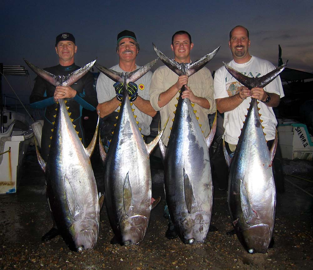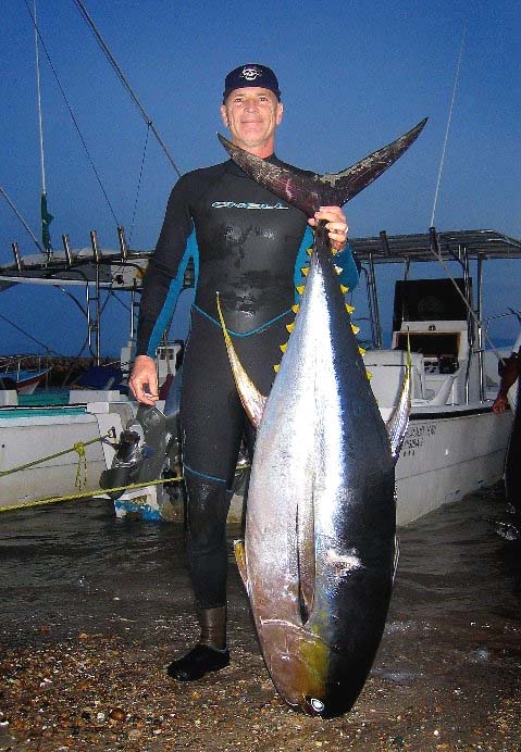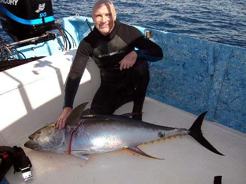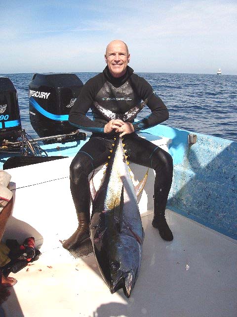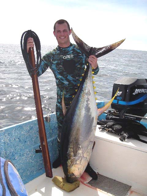 Mike....Some days everything just comes together as if it was meant to be. Our first day of tuna hunting in Mexico last week was one of those days. The force was with us. It was a smooth ride to the outer banks the sky was blue and the water was warm...but more importantly there were schools of tuna boiling around us and tuna were jumping out of the water after the bait fish. I was still loading my gun when I saw two large tuna cruise below me in the light green haze. I was soon on the hunt, diving steadily to about 35 feet and covering ground on the surface as well. A school passed below me and I dove down towards them for a shot. The fish I was tracking picked up the pace and was leaving me behind when I noticed he was being followed by several more fish the same size. I simply waited to let one of them come by and fired. Soon I landed my largest tuna to date, 65 lbs. My friend Dan soon got his new personal best, a fat tuna of 140 lbs. Later that morning Del shot his new personal best at about that same size. He had already landed a 70 lb wahoo . Soon afterwards I had another school of tuna come by and I upped my personal best to 90 lbs. A little later I saw Skips float standing straight up and I knew he was on too. His weighed about 150 lbs. I was very happy to see that we now all had fish. Except for when I was loading my gun, every sighting of tuna that day by any of us had resulted in a fish on the deck......Near the end of the day I saw a group of about 8 tuna as I was dropping for a dive. I slid down to their level , moved in slowly and fired, hitting a fish broadside. He veered off from the rest of the school with the shaft sticking out evenly on both sides. I headed up toward the surface to get air. A 40 minute fight ensued as he pulled the buoys down repeatedly. Little by little I slid the buoys down the bungee float line to pull the fish towards the surface until they were at the 30 ft shooting line.The fish continued swimming in circles pulling hard. I was impressed with how strong he was. Eventually he was exhausted and I was able to pull him up to the boat for a gaff. It was another personal best for me at 160 lbs! .......The next day we were turned back to port by rough seas and the day after that we were all skunked for the day. But years from now all we'll remember are the personal best tuna fish we all landed that first day in Mexico 2007.....Here are the pictures.....Mel