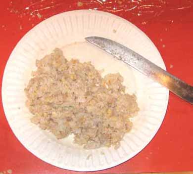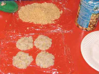 Abalone is sticky. You can mix a lot of filler in it. Don't. Do not use more than 1/4 filler per quantity of abalone or you will ruin its mild flavor. Probably use less. Mix it all together. You may want to oil your hands a bit first to keep it all from sticking too much, but it's going to anyway. Don't put spices in the fritter mix or they may not be cooked correctly. Any spices you use should be in the oil/butter mix.