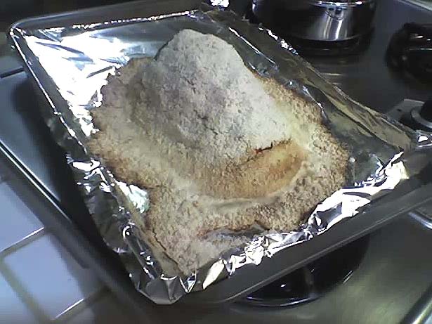 The objective is to pack the food to be cooked in course salt (not rock salt). The salt makes a shell that acts as a double oven. It is the best flavor from lobster I have had and I've tried a lot.
