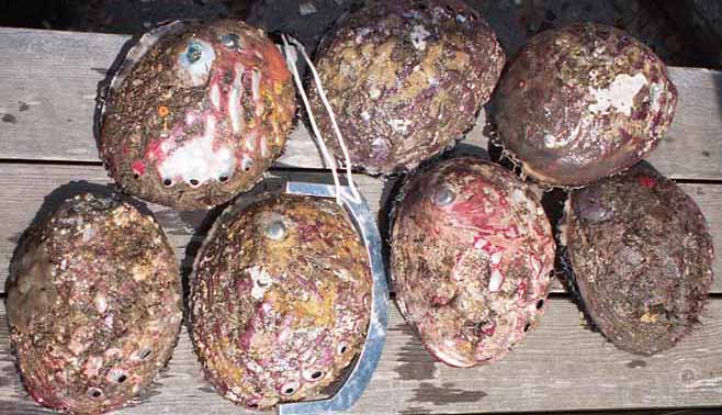 Sea RanchWe got back to Sea Ranch and had some tasty salad that Debbie had prepared. We put our gear on again and headed for the water just about 75 yards from the house. As I had told Eric, it looked like OK diving here, but perhaps 175 yards south, the coast angled in about 15 degrees at a cove and point. Beyond that, the wave action was just a bit calmer. While there was nothing in the way of big waves, these had some power to them and were not to be ignored. They had a short period with less power than a storm wave, but some solidness to them. Still, it wasn't Spring or anything nasty like that, so caution was more called for than raw nerve. The cliffs rose about 60 feet high above the ocean, but easily passable if you followed the contours of the geology. We proceeded south and I offered Eric one option I had considered. We could enter on the north side of the cove, a jump in entry, swim out and across the cove entrance, around the point and exit on the other side. It looked like good ab territory all the way, but it would have been a long, tough, exposed swim. We agreed that it was better saved for another day when we had not already done a long swim. It might also be better advised on a calmer day. Besides, did we really need that much adventure? We walked past the cove and on to where the offshore rocks of the point ended. Past here it was just a bit calmer and again, it was a place to just exit off the rocks and go on in. We decided to try an entry just a little protected by the offshore rocks. I carefully noted that the seals on the rocks of the point seemed unperterbed. That does not mean that the landlord is not about, but it does mean that the seals don't know he's there. The geology ran almost completely parallel to the coast line. I did not like how soft the sandstone was both because of the climb and because of it's likely nature in the water. It was dissolved by seawater into fantastic shapes. It made for skinny ridges with deep skinny canyons between them. I expected the topography in the water to be similar. We geared up in a long shallow tidepool and considered one entry that looked possible from the ocean entrance of this tide pool. Eric had these huge, long freediving fins instead of his smaller fins that he had used for the earlier scuba dive. After watching the waves at the mouth we went to the other side to just try entering between the rocks. It was nearing high tide and the entry would have been easy enough, but near 6 feet out from the water entry was about 15 feet of rock ridge sticking up that we would have to go around to the north or south. Since I could see that all rips were going south, I went in north, but Eric went around south. It wasn't really difficult either way, but the exit would most likely be more entertaining. We swam out past the line of the offshore rocks where Eric dropped his anchor. I tied my float to his instead of tying off to kelp as is my usual habit. By the way, the backpack innertube floats that North Coast divers use, work fantastically. I looked around to evaluate conditions, nearby rocks, bull kelp patches and to make sure what the currents were. If I started to move, I would know it right way. That is about the most important thing to watch. Waves announce themselves, but currents can sneak up on you. Now it was time to dive. I always wonder if I'll have my form this year. I wonder if my recent injuries will slow me down. There's only one way to find out. Eric seemed comfortable. I was in my place. I took my air and made sure to do a high footed surface dive and down I went. At 8 feet you see the green of eel grass so you edge out some to go over the rock side. At 12 feet you see the small kelps, so you edge out some more. Then it's straight down the rock side to the bottom of the canyon at its base. I was running short of air, so I didn't try to get under the bottom laminareas, but turned above them to follow the canyon and see what it was like here. I just love flying between the bottom rocks and then turn up and everything opens up as you approach the surface under some bull kelp. Before you reach the surface, quit swimming and just clear your snorkel as you broach the surface. Not bad, but not at all good. As expected it would take few dives for my body to get adjusted. I looked at Eric to make sure. He was doing his thing, so breathe and do it again. My third dive, I knew I had it. Actually I was surprised how comfortable I was. I hope I thanked God. I took air and followed a rock face down to the bottom and went perhaps 10 feet before I saw an overhang that went back near 6 feet. There were abs, but there was a rock in the entrance as well. There was a big one on the overhang, in just bit, but the rock was only 2 inches from its shell. I looked at it good, but decided against it. I don't mangle out abs and I only carry a very small iron. Maybe, maybe not. No and up I go. There were two more farther in, but I wanted to explore so I really didn't want to work them. Besides, I could find them later if I wanted. Again I waited for Eric to surface. He must have been having fun because it took a fair while, but he didn't seem at all stressed from the depth. A lot of divers just can't handle that depth. It was an easy 35 feet to the bottom of the canyons. Really, to get to the bottom of these canyons was deeper than I often bother with. There is rarely any reason to freedive this deep, but those abs had looked big and I had a spiffy new 9 inch measure that my brother had cut out of 1/2 inch aluminum plate. I wanted to try it and Karl had even put the little bug in my head to look for a 10 incher... the outside of my measure. Eric still looked comfortable enough so I moved over a bit, relaxed on the surface, sucked air for a while and went for it. At the bottom of this canyon I got under the laminareas to look better and then moved fast. It wasn't promising until I came around a small boulder and saw an ab under an undercut. It l