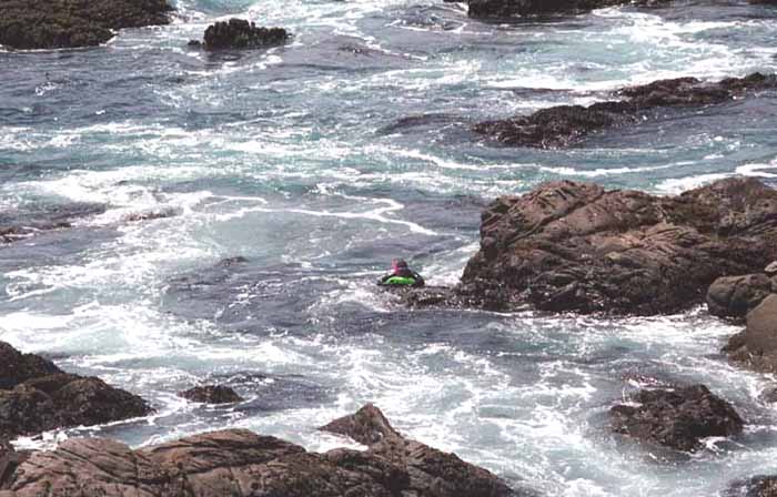 We relaxed a bit, but did have to move up. There was still real wave action coming in where we were. Still, after the swim and the rush of the entry, it's great to just catch your breath sitting in the cool thick kelp. It's a great feeling after a dive and the next stop was to climb that stupid cliff with game and gear, so why hurry... except for the intense sun. It was nice diving with Eric. He was comfortable and competent freediving in deep water and the rough water did not fray his nerves. He had a 9 1/2 incher as well as two others near as big. He was pretty excited from a dive like that. We made it up the cliff and stumbled back to the house. It was nice to get out of the gear and nice to talk diving with someone that new what the reality of diving the North Coast is like. It is far more challenging than any other diving I have ever done. Southern California diving is generally a picnic compared to here. I finally shut up enough for him to get on his way, even though I was still completely wound up in the dive. That's why we do it. ***** The next morning I got up to make scrambled eggs with abalone, Swiss cheese and champagne. I figured that it was a recipe that only the French could have come up with. A bit after 7 AM, both Joe and Karl were there. Joe I had met at Sea Ranch and he preferred to dive with other divers if they were available. He knew the area some and sounded like a good diver. He was going to be diving there all week. I knew Karl from the board and he sounded like he really enjoyed abalone diving as well. We headed back towards where I had dove the day before, but this time it would be a slightly minus tide. Again we went down the cliff, but things looked extremely different, partly due to the different lighting and partly due to the low tide. The tidepool that we had entered from yesterday was completely empty. The chute we went through was deeper and extended farther out. It was also a bit rougher. We climbed down until we were on rocks completely covered with small brown kelps. As we geared up, our breath made huge plumes of mist. Thin sea mists drifted by, but quickly vanished in the morning sun. The entry was similar to on the last day, but a bit more lively across the shallower rocks. Joe and I headed out to the outside of the reef area as before and Karl decided to stay farther inside. I decided to move away from the offshore rocks this time instead of towards them. This time some of the pinnacles were within 2 to 4 feet of the surface. If they are that shallow, I always at least try to stand up on one. It amuses me to be able to stand up that far offshore. It was a short lived triumph before I was swept off. The water out here was moving pretty good. Really, the difficulty of diving here was finding the canyons between the ridges. I was diving deep again and watching both Karl and Joe between dives. Joe seemed to be doing well and Karl signaled that he was OK, but I was just a bit uncomfortable watching how small the calm spot was that he had chosen to dive in. The waves were splashing on the rocks pretty good just 20 feet shoreward from his position and I could see the heavy swell move everything back and forth. I was making deep dives and having the same problem finding abs as the day before, but I got a nice big one soon. I found a line of urchins and so took one that was fair sized. The biggest ones may not be good. I removed the spines with my hands before putting it in the float. It had about a 5 inch test. I got another one and had put it into the float. Just then Joe swam up holding a big ab and said 'thanks, that's my first 9 incher'. Well that was one of the coolest things I've ever been told while diving, but he was the one that got it. I learned later that though he was an experienced diver, he really hadn't tried diving at this depth before and was really glad that I had given him a good opportunity to find out something about what he could really do given the chance. I thought he was a well poised diver that handled the depth and rough water just fine. During this time, both Joe and I were keeping an eye on Karl inside in the rough water. We were both stoked on the fun diving. It was really pretty and I was seeing the same life I had seen the day before, though I was finding more rock fish. At one point I even came upon a large Cabazon, but he did not feel friendly and shot down a rock canyon. After a while, both Joe and I had 3 abs at or near 9 inches. Then came in the set. Generally the waves that were coming in had all been pretty much the same size. They were strong enough, but quite manageable in the deeper water. They mostly just caused boils above the pinnacles or a small wave like a whitecap. This set was probably 2 feet higher and so actually broke above the shallowest pinnacles. That was OK for us. We just got shoved around some, but Karl got hit by a breaker. He was OK, but had to scramble for his float before it got to the rocks. He got back in control pretty fast, but Joe and I talked a bit and said it was very near time to get out. We would try to get one last ab each, but not for long and if it picked up again more than just a set, it was time to bail. I fairly quickly found another ab and got my float untied from the kelp. Joe said he was just a bit tired and was plenty ready to go. Karl was already heading out to us. This is when I stop, relax and try to fix in my mind the beauty of the shore and the waves breaking on the offshore rocks. I certainly won't be back soon enough, yet this is the best part of my life, but it is time to go. I also look at the currents and whitewater we're going to have to go through. Well, I suggested that they follow me in, which seemed OK with them. I said to stay as far north as possible. Just to make things more interesting I was going to try to take pictures as I went in. It's hard to say if that presented more danger to me or my camera. What was on my mind was that there had been some calm wat