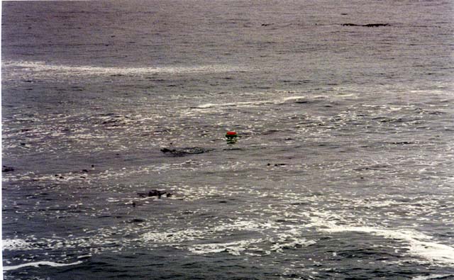 I continued off shore until I was clear and looked back. I hadn't realized how narrow my planned exit area was. It was an opening perhaps 2 feet wide between large straight faced boulders that had some serious waves breaking on them. Well, that was to worry about later. I swam to the outside of the bull kelps, perhaps 100 yards off shore. The lack of wave action suggested it was fairly deep. It seemed like a good place to start out considering that I had not done much serious free diving in the year since I had last been here. As expected, my first few dives were not too good and though I was seeing the rocks at about 25 feet, that was not the bottom. After a few dives, I figured it was time to get serious. I got a lot of air and did a high legged surface dive. Visibility was OK, but at this hour, things are just dim. There were large boulders with thick growth and a strong surge. To look for abalone, you mostly have to get to the bottom of the cracks between them. After a couple of dives I got into a crack that ended at some rocks and under one, I saw my first abalone of the season and it was a fairly big one. I had no trouble with my iron and popped it off before leisurely swimming to the surface.