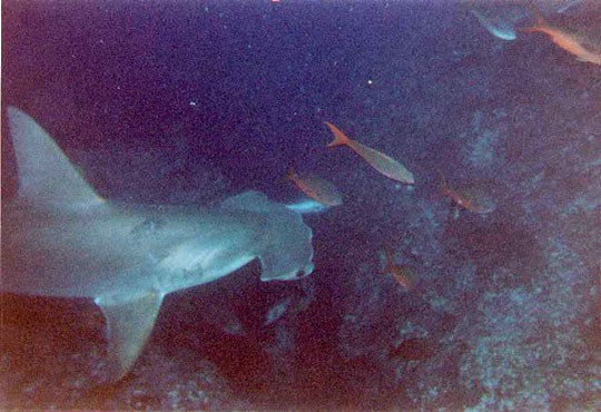 The Zodiac was huffing and puffing just to get us there. The overcastted skies had dropped the surface temperature, there was a light rain and the swells were big enough to spray everyone constantly on our way there. As soon as we back rolled we notice that our mild drift was now a strong and fast current. The visibility was still around 50 feet and we had to fight our way to get to the other underwater sea mounds that lay northward of Dirty Rock. Going to these mounds a cleaning station was in progress and we where delighted by the presence of hammerheads. I can not say how many of them since we could just make up shadows beyond 50 feet but the 10 or 15 that where close, got really close. Once we spotted where the barber fish were we took again our place on this natural theater, grabbed a rock, hold our breaths and one by one, the big predators of the oceans would approach for service. My thoughts were; thank god for the "El Niņo". Mark had mentioned that it was possible that due to the high water temperatures and lousy conditions of the previous year sharks had developed lots of fungii. Being them deeper than usual the barber fish and the king angel fish had not been able to clean the out. Now it was a different story. Cleaning stations where found almost at every site and once you find them you can never get enough of these predators high above in the food chain. Their phony looking head, their menacing teeth, and their bodies covered with some kind of sleek, stealthy material make you wonder and think how perfect these creatures are. Since our check out dive I had been battling with my mask since it was leaking horribly. I don't know if I'm wearing it to tight, or too loose but did try both things and it didn't fix the problem. I'm beginning to think that I have some knew face wrinkles since my last dive trip. While clearing the mask I raised my sight just to become mesmerized by a huge yellow fin tuna that could have fed the entire boat for the week to come. This beautiful, blue and yellow fish was some 300 lbs. and moved at such a high speed that if you blink you loose. My mouth was wide open and I was amazed with such amounts of marine life that I couldn't have imagined in such vast numbers. What made me drop the regulator out of my mouth was when I saw a pod of 20 to 30 dolphins some 50 to 60 feet away from me and against the few rays of sun that were getting through. The graceful downward motion of their tails called for no mistake. Their role in this mental film was brief but it became the necessary ingredient to make it become a classic. One that I will be able to play over and over again, here in my head, for the rest of my life.