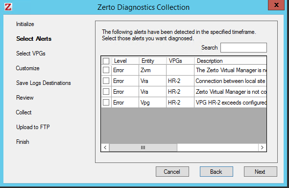 To collect logs for Zerto support to use when troubleshooting:. This option enables you to specify the logs that you want to collect, generated by Zerto Virtual Replication, for example VRA logs, as well as logs generated by VMware, for example, vCenter Server logs or host logs. The Zerto Virtual Replication generated logs can be filtered by any alerts issued and by the VPGs that require analysis to identify problems.