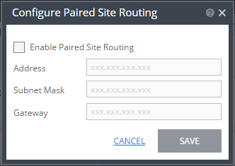 The settings in the Configure Paired Site Routing dialog apply to all VRAs installed after the information is saved. Any existing VRA is not affected and access to these VRAs continues via the default gateway. If the default gateway stops being used, you must reinstall the VRAs that were installed before setting up paired site routing.