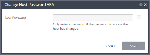 VRAs installed on ESXi 4.x and 5.x hosts require a password to access the host. This password is supplied as part of the installation of each VRA. The password is required for situations such as rebooting or upgrading the host. If the password for a host is changed you can change the password stored by the VRA by editing the VRA, either for a specific VRA, or when multiple hosts have their passwords changed, each with the same password, you can update the password information for the affected VRAs.