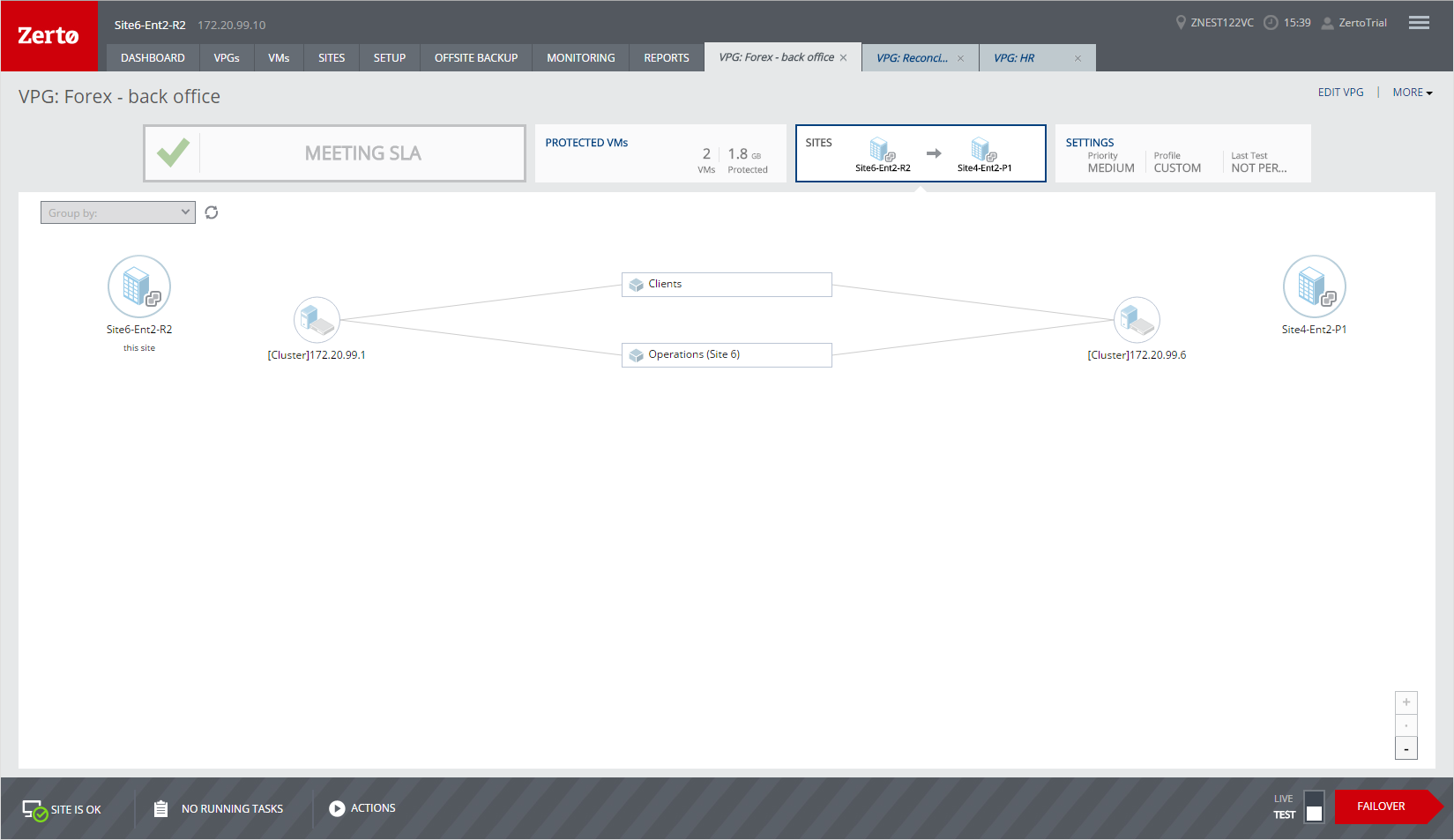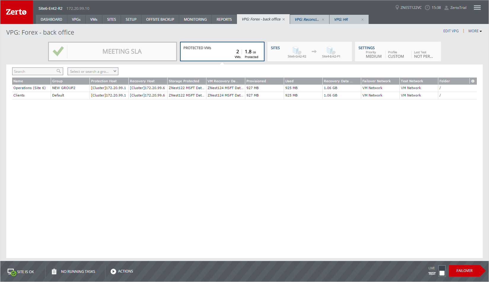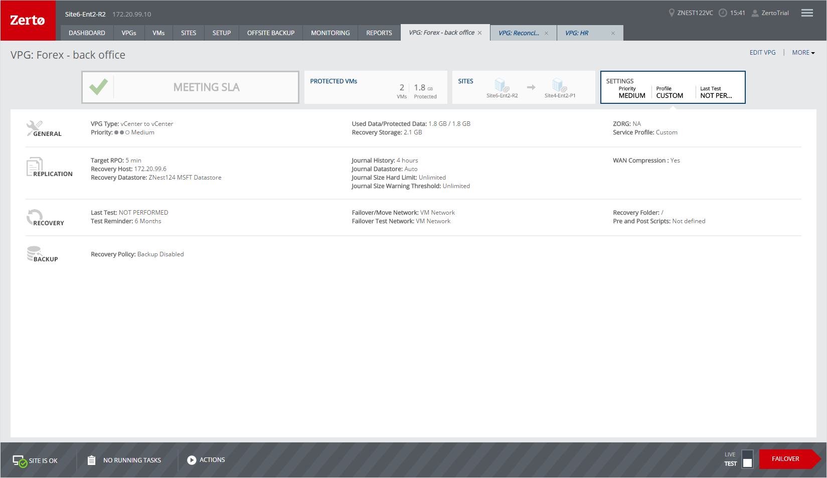 The SITES tab shows the topology of the VPG, including both the protected and recovery sites.