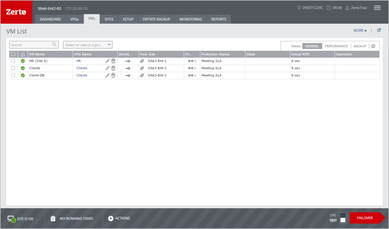 Last Test – The time and date of the last backup performed by Zerto Virtual Manager.