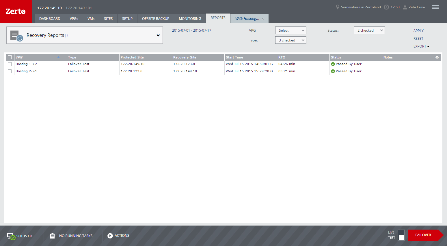 Information about recovery operations — failover tests, moves, and failovers — can be displayed in Recovery Reports under the REPORTS tab. The information includes the protected and recovery sites involved, when the recovery operation was started, the time it took to bring up the machines in the recovery site, the RTO, and whether the operation succeeded or not, and any notes added during a failover test.