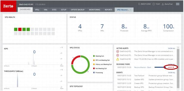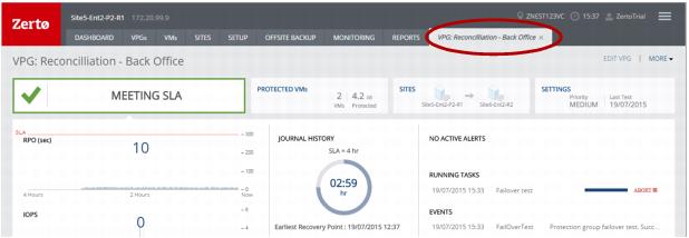 ■ In the Zerto User Interface, click the VPGs tab, and then click on the name of a VPG you are testing. A dynamic tab is created displaying the specific VPG details including the status of the failover test.