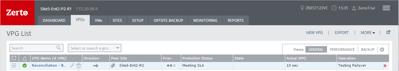 ■ In the Zerto User Interface, click the VPGs tab. The Operation field in the GENERAL view displays Testing Failover when a failover test is being performed.