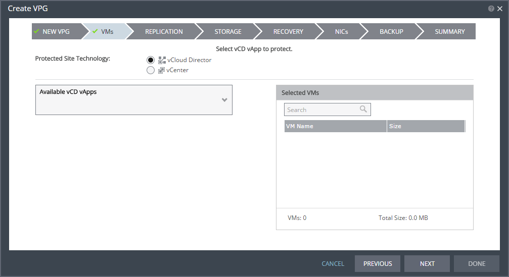 You can select virtual machines to protect from the underlying vCenter Server or as a vCD vApp.