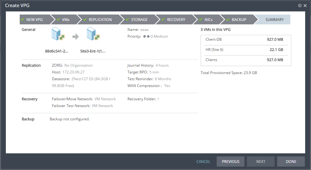 The SUMMARY step is displayed. It shows the VPG configuration that you defined in previous tabs.