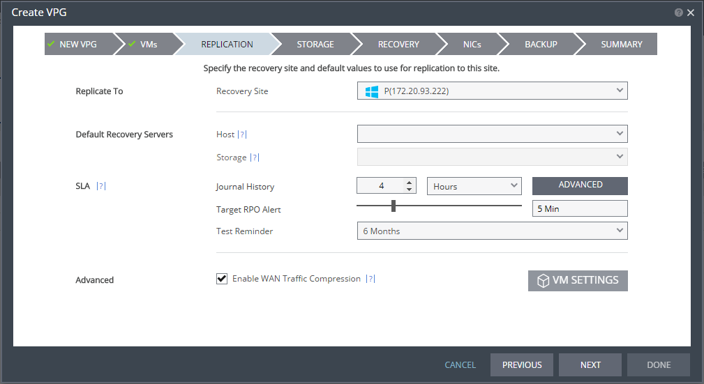 Enable WAN Traffic Compression – Whether or not data is compressed before being transferred to the recovery site. Compressing the data is more efficient but results in a small performance degradation. Enable WAN traffic compression if network considerations are more critical than CPU usage considerations. Even if WAN compression is selected, Zerto Virtual Replication decreases the level of compression if it takes too many resources. The VRA automatically adjusts the compression level according to CPU usage, including totally disabling it if needed. Zerto Virtual Replication can also work with third-party WAN optimization and acceleration technologies, such as those supplied by Riverbed Technologies and Silver Peak. When third-party WAN optimization is implemented, Zerto recommends disabling VPG WAN compression.
