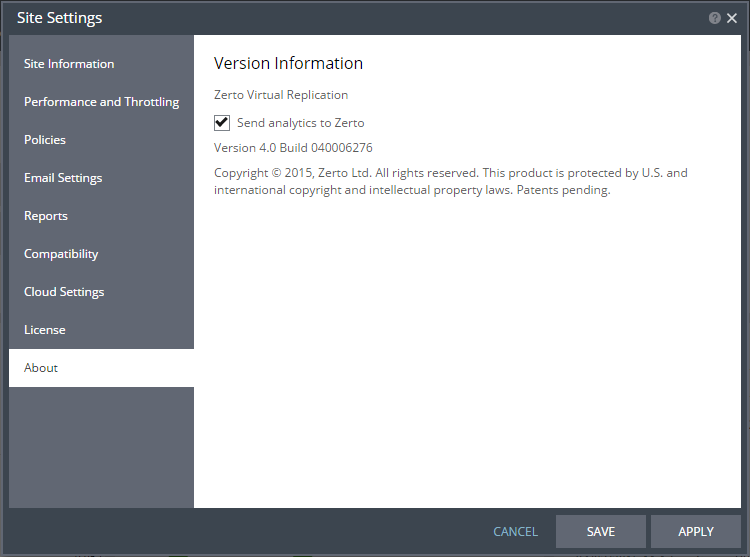 The About dialog includes the Zerto Virtual Replication version number and whether to allow analytics to be sent to the Zerto Call Home server to help improve Zerto Virtual Replication.
