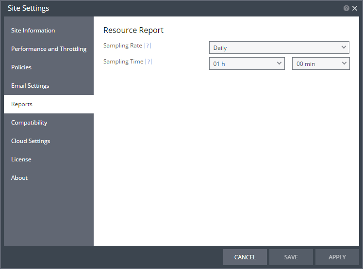 Sampling Rate – When to take resource samples to identify resource usage, either daily at a specific hour and minute or hourly at a specific minute within each hour. Note that collecting a sample hourly provides a higher resolution picture of replication traffic than if samples are only collected once a day.