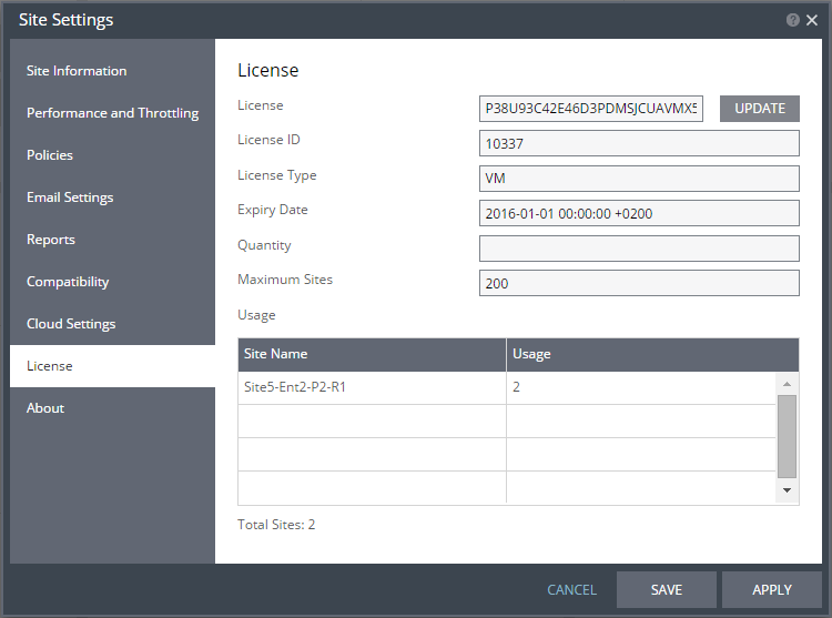 Usage – The sites using the license and number of protected virtual machines in each site. The number of virtual machines is independent of whether they are in vApps or not.