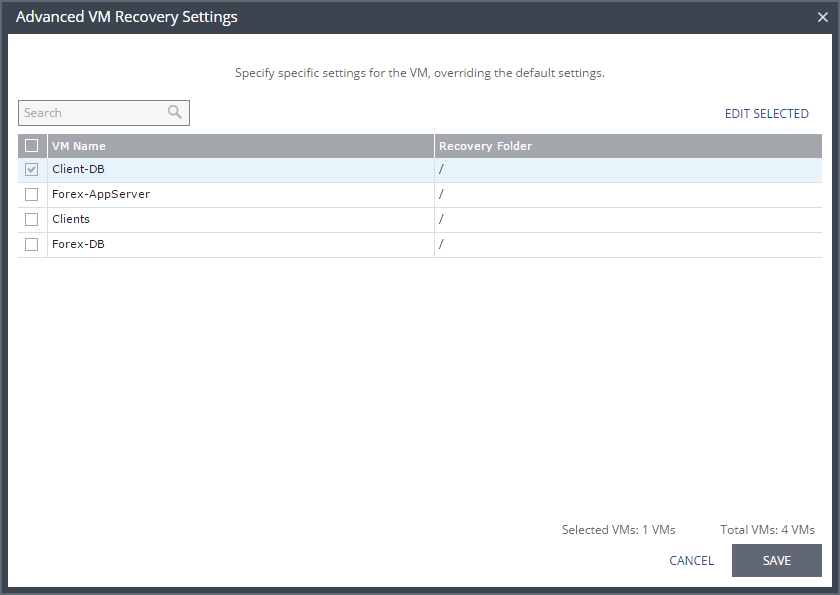 Displays the recovery settings for the virtual machines in the VPG. You can choose to edit the settings for one or more virtual machines by selecting the virtual machines and clicking EDIT SELECTED or by clicking the pencil icon for inline editing.