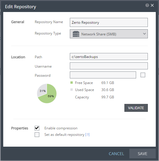 Enable compression – Check this option to compress backups stored in the repository. Compression is done using zip compression, set to level six. If you want better compression, which requires more CPU, or less compression to reduce the CPU overhead, contact Zerto support.