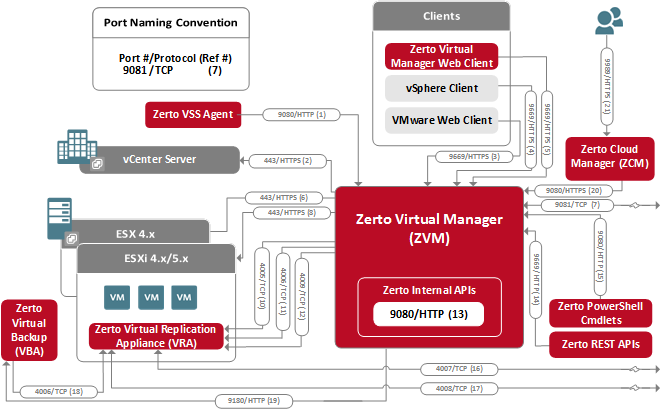 3, 4, 5, 14 | 96691 | Communication between a machine running the Zerto User Interface, vSphere Web Client or Client console and the Zerto Virtual Manager for the relevant vCenter Server and between the Zerto Virtual Manager and Zerto REST APIs. |