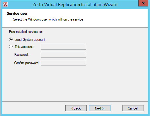 This account – Use a specific account as the user account to run the Zerto Virtual Manager service, which is installed as part of Zerto Virtual Replication. The account must have unrestricted access to local resources.