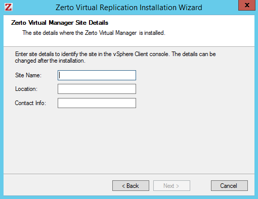 You can install Zerto Virtual Replication using the defaults provided by Zerto. Site information and information to connect to vCloud Director can be provided, if required, after the installation in the Zerto User Interface.