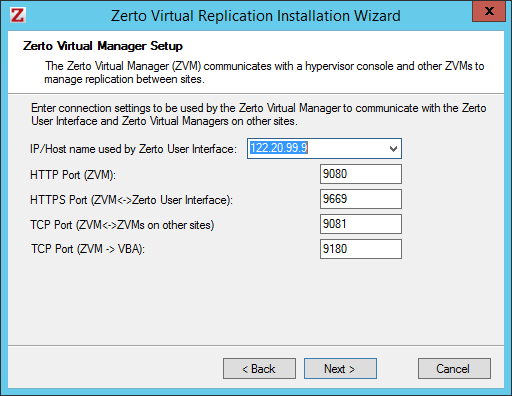 TCP Port (ZVM -> VBA) – The port used for communication between the Zerto Virtual Manager and the Virtual Backup Appliance.
